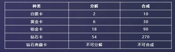 每张卡牌可被分解成数量不同的卡牌碎片,并用于合成指定等级的卡面(钻石典藏卡除外),合成及分解的碎片数量如下: