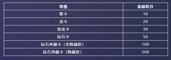 每张卡牌根据等级高低带有不同的基础收藏分,此外钻石典藏卡中的特殊编号还将有额外的收藏分加成(加分规则见附录)